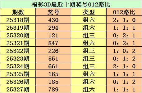 开奖回顾:第2025327期3D奖号为789。格式:组六,奇偶比2:1,大小比3:0,012路比为1:1:1。